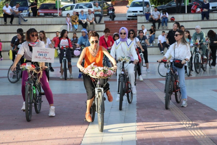 Renkli kıyafet giyen kadınlar, balon, çiçek ve oyuncaklarla süsledikleri bisikletleriyle tur attı.