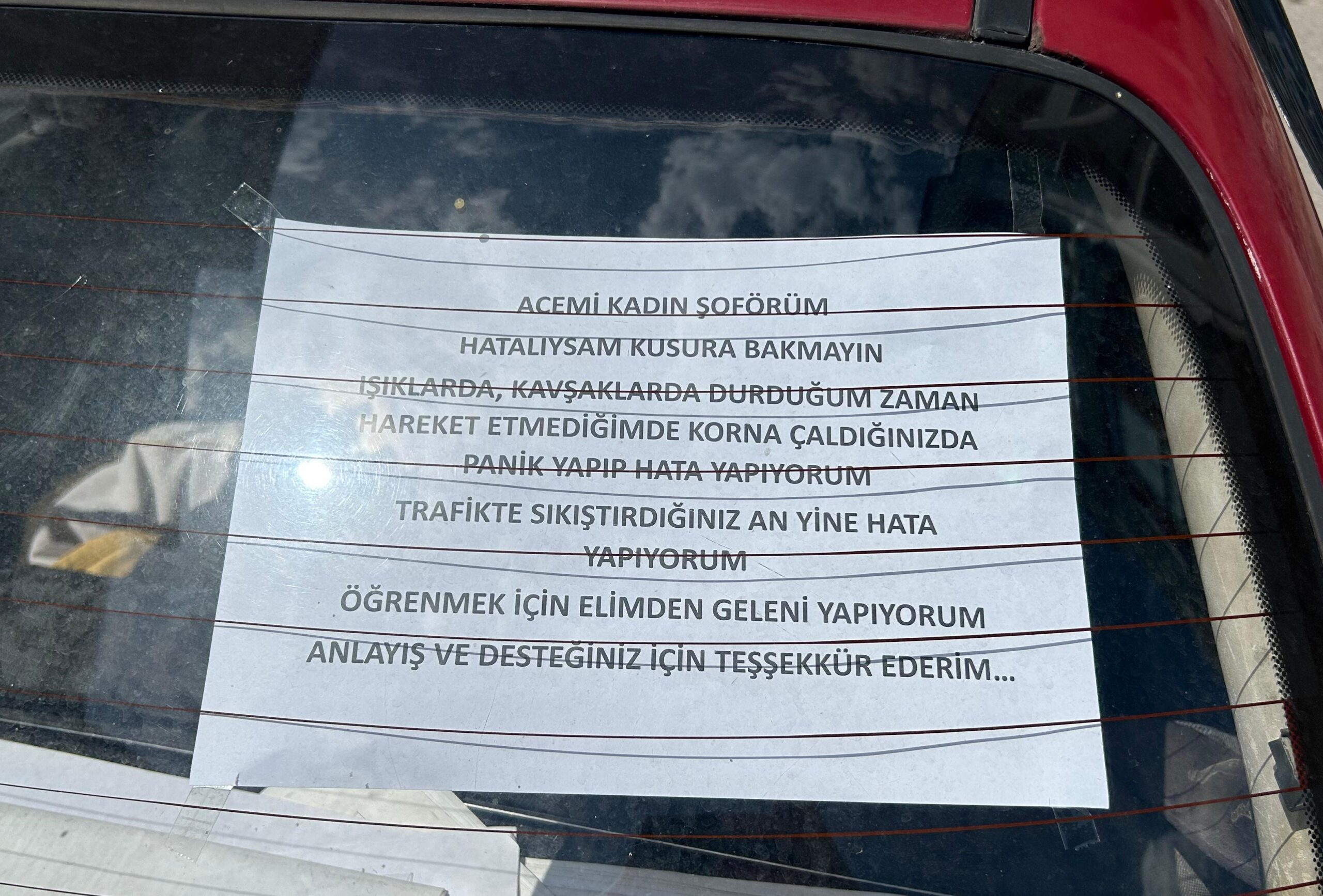“Acemi kadın şoförüm. Hatalıysam kusura bakmayın. Işıklarda, kavşaklarda durduğum zaman hareket etmediğimde korna çaldığınızda panik yapıp hata yapıyorum. Trafikte sıkıştırdığınız an yine hata yapıyorum. Öğrenmek için elimden geleni yapıyorum. Anlayış ve desteğiniz için teşekkür ederim.”