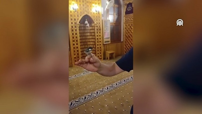 Cemal Caymaz Camisi’nde namaza giden bir kişi, minaredeki yuvadan düşen kuş yavrusunu fark etti.
