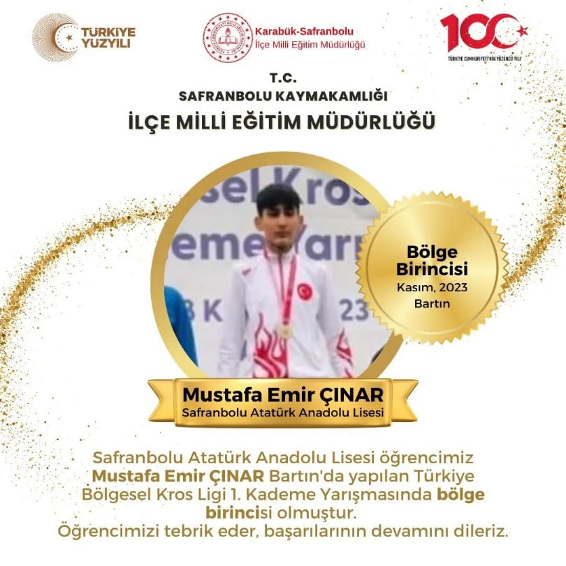 Safranbolu Atatürk Anadolu Lisesi öğrencisi Mustafa Emin Çınar Bartın’da yapılan Türkiye Bölgesel Kros (3 km) Ligi 1.kademe Bartın müsabakasında birinci oldu. Safranbolu İlçe Milli Eğitim Müdürü Said Nuri Odabaşoğlu bölge birincisi olan Mustafa Emin Çınar’ı tebrik ederek başarılarının devamını diledi.