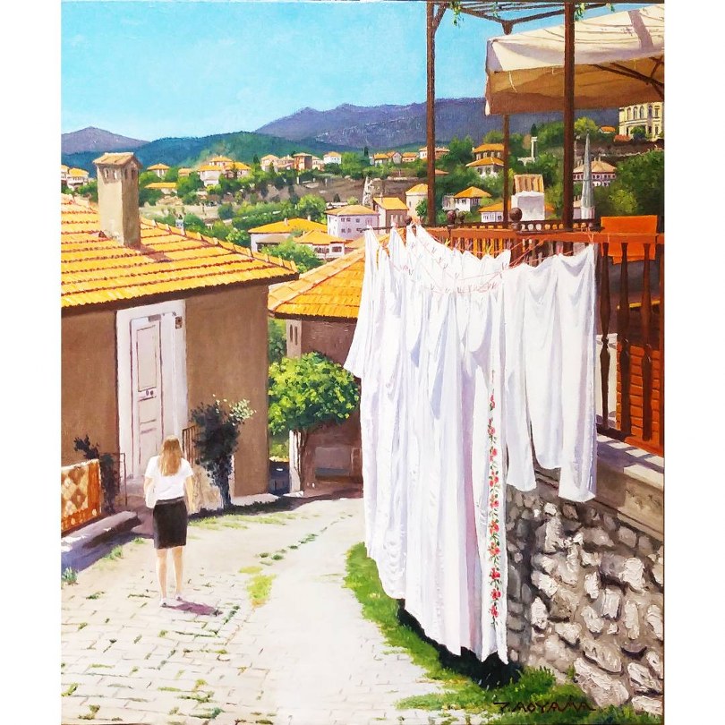 Safranbolu’yu bir sanat eseri olarak tasvir ederken, “Safranbolu, Osmanlı Dönemi’nden kalma evlerin ve İpek Yolu boyunca seyahat eden kervanların konakladığı hanların hala ayakta olduğu küçük bir kasabadır,” diyen AOYAMA, bu kasabanın tarihi dokusunu resmine yansıttığını belirtti. Ayrıca, kaldığı pansiyonun terasından izlediği Safranbolu manzarasını anlatırken, “Burası, eski bir konaktan pansiyona çevirilmişti ve odamın penceresinden görünen Safranbolu’nun panoramik manzarası muhteşemdi. Şiddetli bir sıcaklık, kuvvetli yaz güneşi ve göz kamaştırıcı güneş ışığı… Yıkanıp asılmış çamaşırlar ise ara sıra hafifçe esen rüzgarda sallanıyordu,” ifadelerini kullandı.