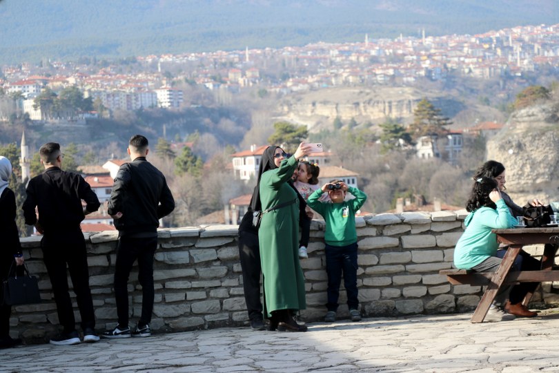 Ziyaretçiler, yokuşların çokluğu ve hafta sonu yoğunluğu nedeniyle şehir merkezinde uzun süren gezintilerinin ardından Hıdırlık Tepesi’nden şehir manzarasını seyrederek yorgunluklarını attı.