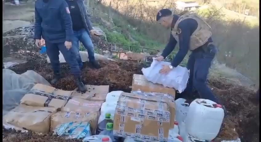 Şahsın sahte içki yapımında kullandığı etil alkol bidonlarını gübre içerisine gömdüğü belirlendi. Gübreyi kazan jandarma ekipleri, bidonları ve içi dolu içki şişelerini ortaya çıkardı. Evde toplam 660 litre etil alkol, 130 litre viski ile 2 bin 480 boş içki şişeleri ele geçirildi.