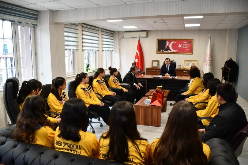 Voleybol Turnuvasında Karabük İl Birinciliği alan Emek Ortaokulu Şampiyon Yıldız Kız Voleybol Takımı İlçe Millî Eğitim Müdürü Odabaşoğlu’nu makamında ziyaret ederek kupalarını takdim etti. Okul Müdürü Yüksel Yıldız, Takım kaptanı Öğretmeni Dilek Toprak Kogo, Emek Ortaokulu Beden Öğretmenimiz Serdar AYDIN, öğrencilerimiz Elif Ela GÜNEŞ, Melis Altunay, Merve Altunay, Derin Kaplan, İpek Uluyurt, Ceylin Ceren Soykal, Göknur Aybüke Tuncer, Zeynep Dila Akbulut, Ülkü Aden Yıldız, Ayça Küçükcesur, Meyra Kazancı ve Nehir Yeşilçam’a başarı belgeleri İlçe Milli Eğitim Müdürü Said Nuri Odabaşoğlu tarafından verildi.