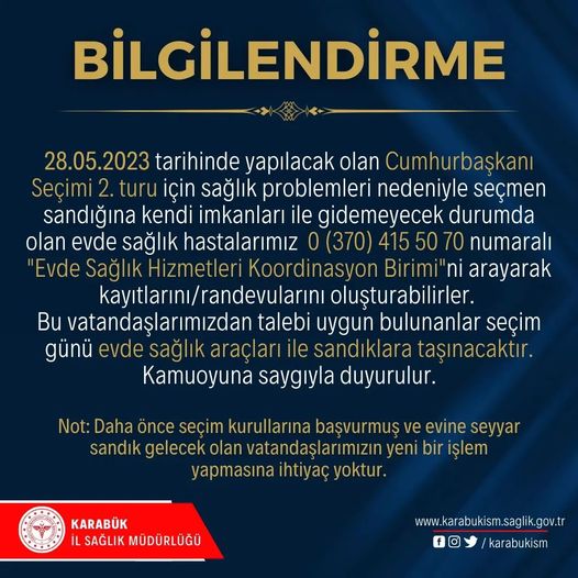 Karabük İl Sağlık Müdürlüğü tarafından paylaşılan bilgilendirme notunda, “28.05.2023 tarihinde yapılacak olan Cumhurbaşkanı Seçimi 2. turu için sağlık problemleri nedeniyle seçmen sandığına kendi imkanlarıyla gidemeyecek durumda olan evde sağlık hastalarımız 0 370 415 50 70 numaralı ‘Evde Sağlık Hizmetleri Koordinasyon Birimi’ni arayarak kayıtlarını/randevularını oluşturabilirler.Bu vatandaşlarımızdan talebi uygun bulunanlar seçim günü evde sağlık araçları ile sandıklara taşınacaktır.” denildi.