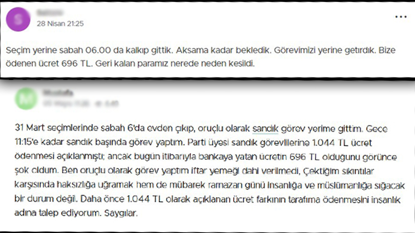 Partili üyeliler sandık görevlerinde sabahın erken saatlerinde gidip gece yarısına kadar görev başında zaman tükettiklerini ve bu emeğe 696 TL’nin değmediğini söyleyerek tepkide bulundular.