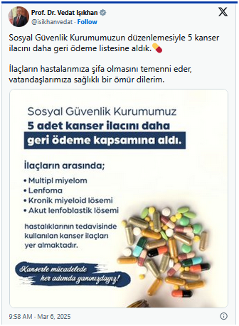 “Sosyal Güvenlik Kurumumuzun düzenlemesiyle 5 kanser ilacını daha geri ödeme listesine aldık. İlaçların arasında multipl miyelom, lenfoma, kronik miyeloid lösemi, akut lenfoblastik lösemi hastalıklarının tedavisinde kullanılan kanser ilaçları yer almaktadır. İlaçların hastalarımıza şifa olmasını temenni eder, vatandaşlarımıza sağlıklı bir ömür dilerim.”