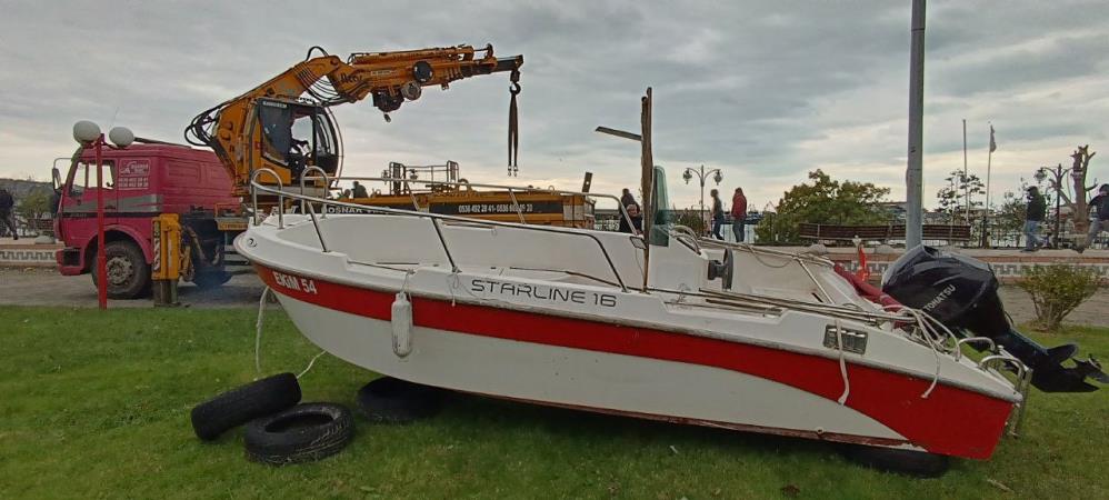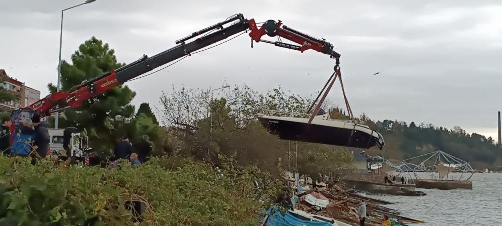 Hasarlı tekneler vinçle karaya çıkartıldı