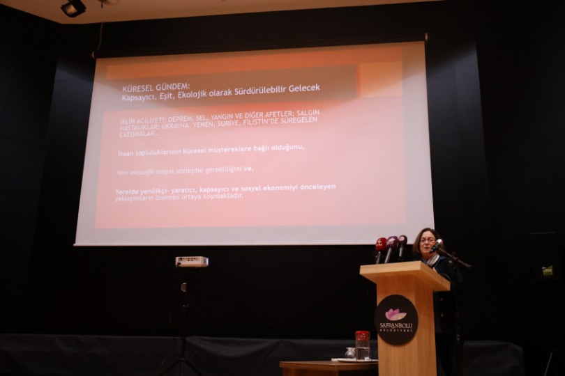 Prof. Dr. Gülden Erkut konferansta odak grup toplantılarından çıkan sonuçları ve üretilen projeler aktardı. Safranbolu’da, insan odaklı sürdürülebilir kalkınma hedefine yönelik üretilen projeler doğrultusunda katılımlı ve kapsayıcı yerel yönetimin kurumsallaşması sağlanacak. Sürdürülebilir tarım, kapsayıcı ve dayanıklı kentleşme, kültürel endüstriler ve kültür turizmi üzerine üretilen projelerin gerekli finans kaynakları temini ile hayata geçirilmesi planlanıyor. ‘’Safranbolu, Türkiye’de bu kapsam ve etkinlikte bir sivil katılım mekanizmasına sahip ilk şehirlerden bir olacak’’ Konferansın açılış konuşmasını yapan Safranbolu Belediye Başkanı Elif Köse konuşmasında şu ifadelere yer verdi: ‘’ Safranbolu’da katılımlı ve sürdürülebilir kent ideali için gerçekleştirilen toplantıların ikinci aşamasını gerçekleştirdik. Safranbolu belediyesi ve Sürdürülebilir Kentsel ve Kırsal Kalkınma Platformu iş birliğiyle düzenlenen çalıştay programı iki aşamadan oluşuyordu.