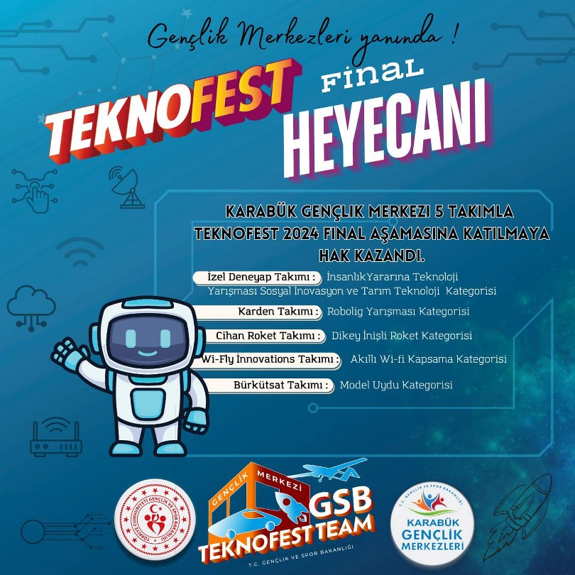 Teknofest 2024’ün büyük finalinde Karabük’ün genç teknoloji temsilcilerine başarılar dileriz. Karabük Gençlik Merkezi, bu heyecan verici yarışmada genç yeteneklerin yanındadır ve desteklemeye devam edecektir.