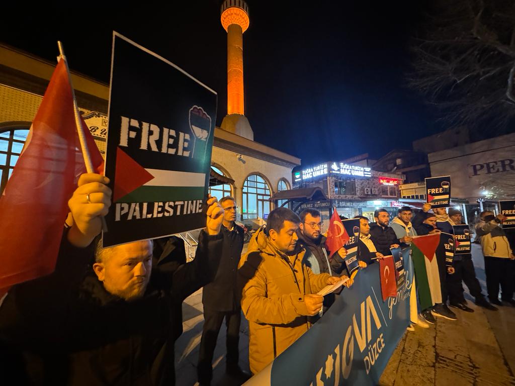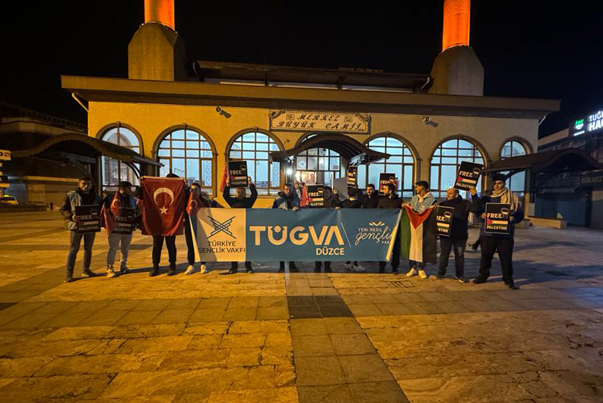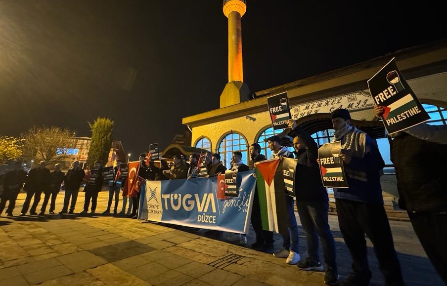 TÜGVA Düzce İl Temsilciliği üyeleri, ellerinde Free Palestine (Özgür Filistin) pankartı, Türk ve Filistin bayraklarıyla yatsı namazı sonrası Merkez Büyük Camisi önünde toplandı.