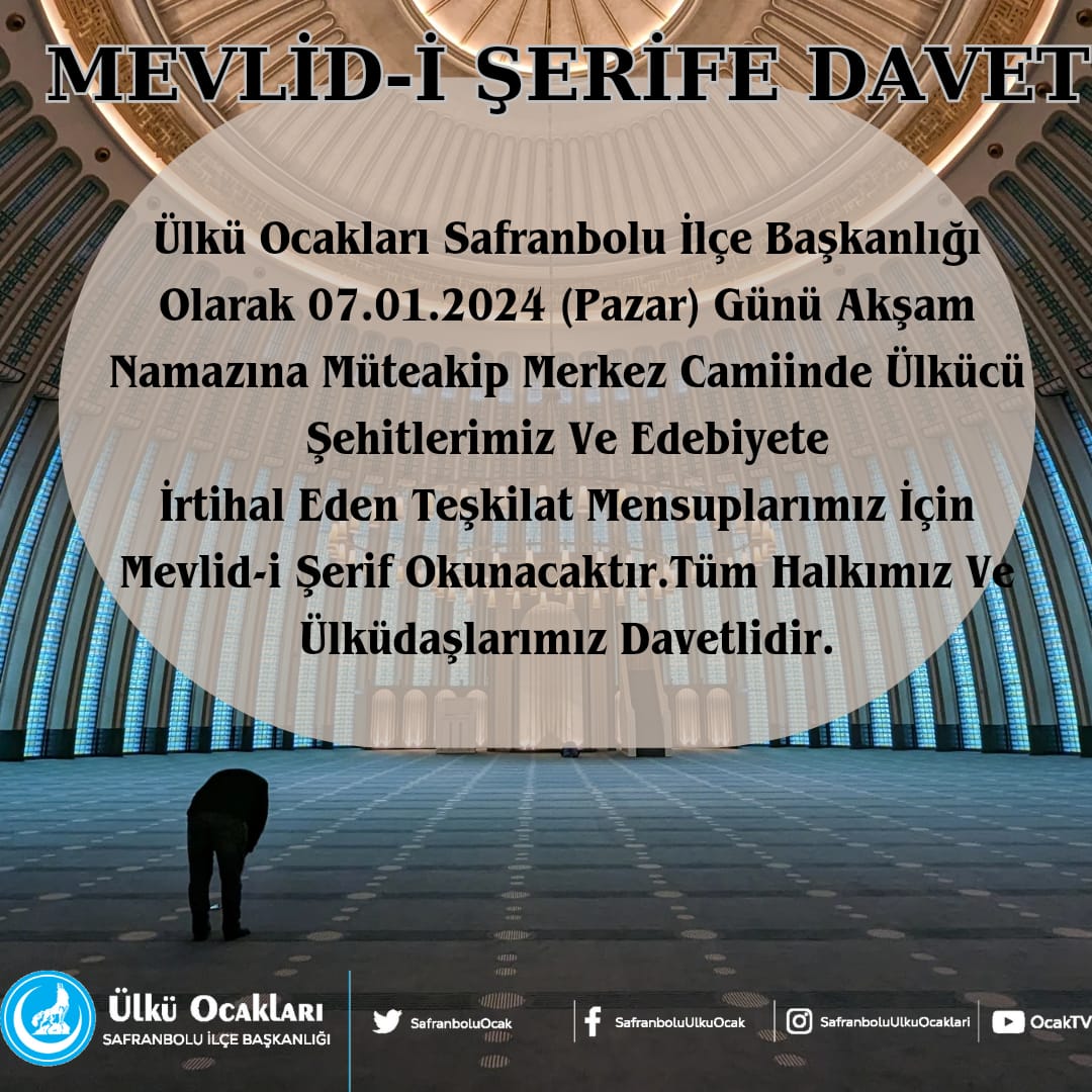 Safranbolu Ülkü Ocakları Eğitim ve Kültür Vakfı Başkanı Emrah Özmen, Mevlid-i Şerif programıyla ilgili olarak, “Ülkü Ocakları Safranbolu İlçe Başkanlığı olarak 07.01.2024 Pazar (yarın) akşam namazına müteakip Safranbolu Merkez Camii’nde Ülkücü Şehitlerimiz ve ebediyete irtihal eden teşkilat mensuplarımız için Mevlid-i Şerif okunacaktır. Tüm halkımız ve ülküdaşlarımız davetlidir.” dedi.