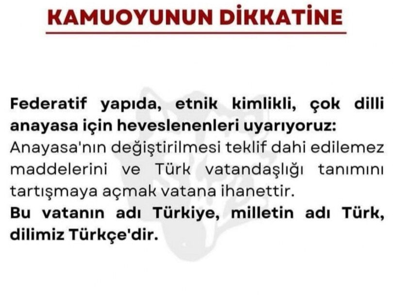 Açıklamasında anayasa için heveslenenleri uyarıyoruz diyen Başkan Deniz, Federatif yapıda, etnik kimlikli, çok dilli anayasa için heveslenenleri uyarıyoruz: Anayasa’nın değiştirilmesi teklif dahi edilemez maddelerini ve Türk vatandaşlığı tanımını tartışmaya açmak vatana ihanettir. Bu vatanın adı Türkiye, milletin adı Türk, dilimiz Türkçe’dir.” ifadelerini kullandı.