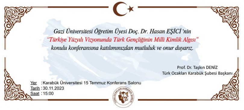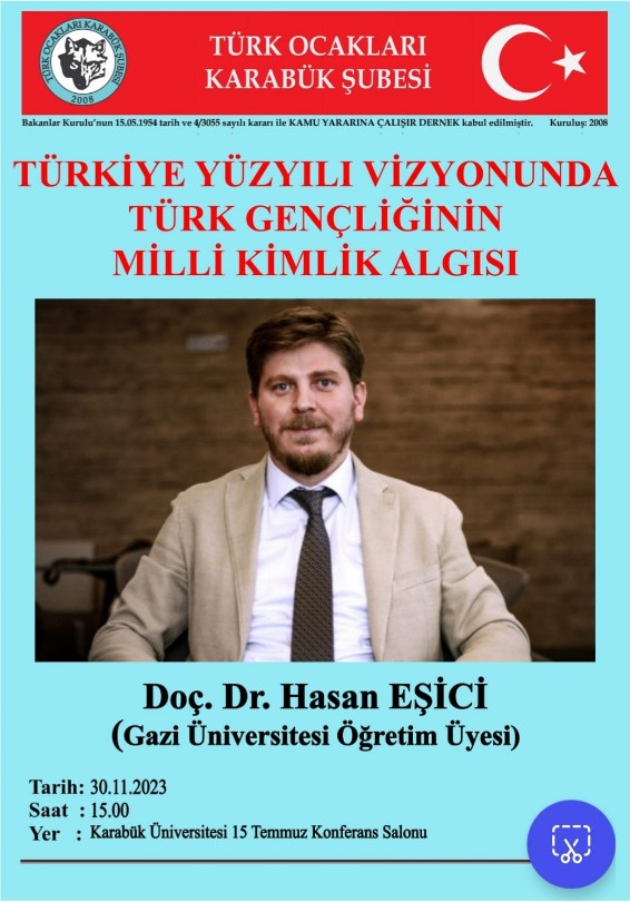 Türk Ocakları Karabük Şubesi tarafından bugün saat 15:00’te KBÜ 15 Temmuz Konferans Salonu’nda Gazi Üniversitesi Öğretim Üyesi Doç. Dr. Hasan Eşici’nin konuşmacı olarak katılacağı “Türkiye Yüzyılı Vizyonunda Türk Gençliğinin Milli Kimlik Algısı” konulu konferans gerçekleştirilecek.