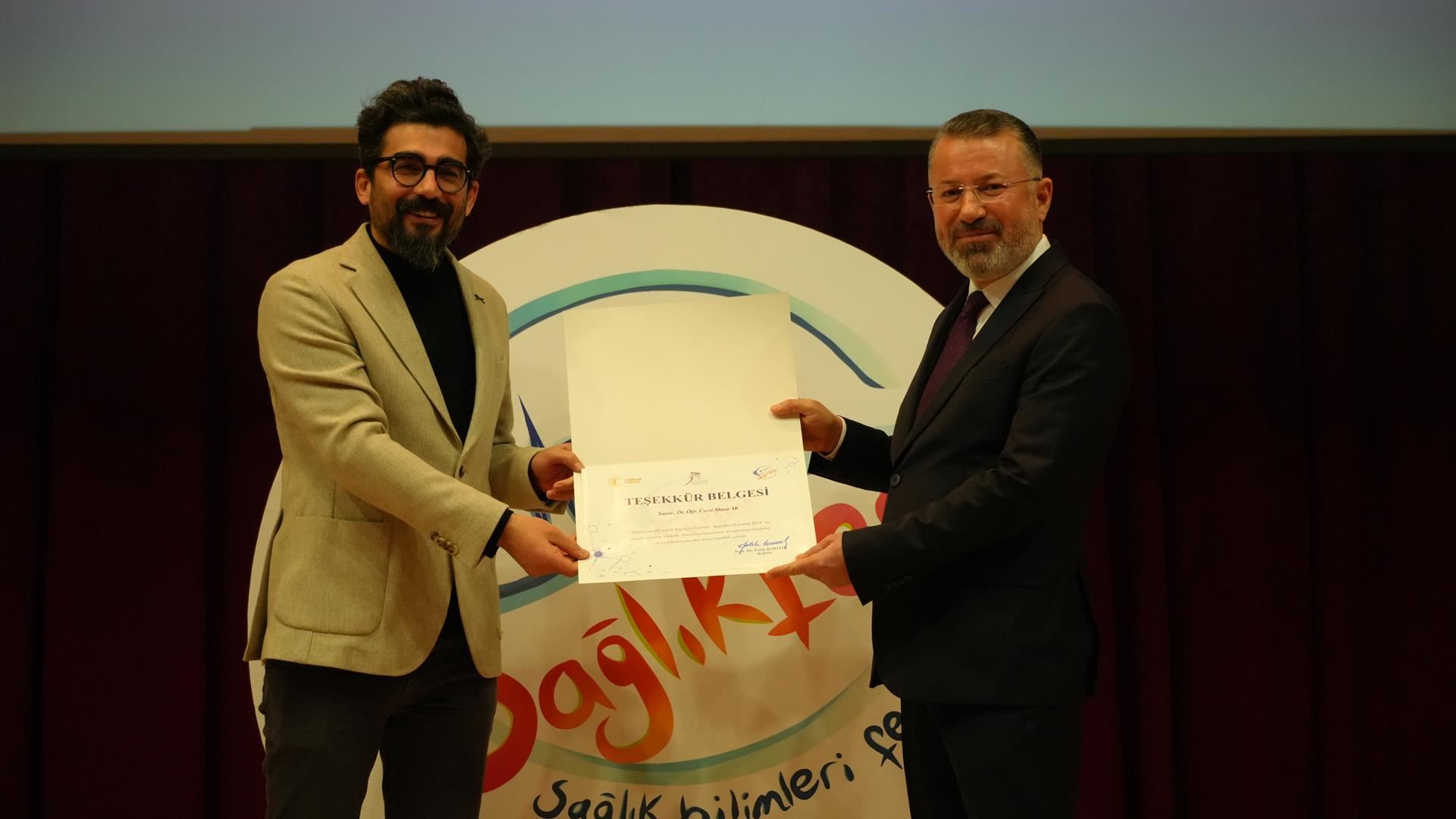 Rektör Prof. Dr. Fatih Kırışık, izleyiciden büyük beğeni toplayan belgeselin yönetmeni Dr. Öğr. Üyesi Musa Ak’a ve görüntü yönetmenliğini yapan Öğr. Gör. Serdar Sabuncu’ya teşekkür belgesi takdim etti.