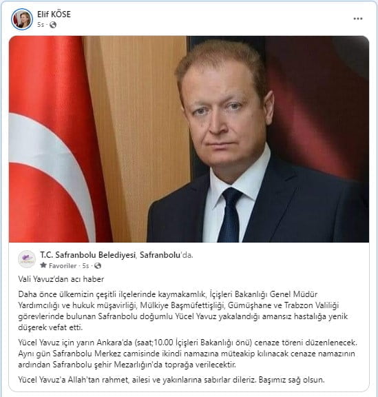 Safranbolu Belediye Başkanı Elif Köse ise, “Daha önce ülkemizin çeşitli ilçelerinde kaymakamlık, İçişleri Bakanlığı Genel Müdür Yardımcılığı ve hukuk müşavirliği, Mülkiye Başmüfettişliği, Gümüşhane ve Trabzon Valiliği görevlerinde bulunan Safranbolu doğumlu Yücel Yavuz yakalandığı amansız hastalığa yenik düşerek vefat etti. Yücel Yavuz için yarın Ankara’da (saat;10.00 İçişleri Bakanlığı önü) cenaze töreni düzenlenecek. Aynı gün Safranbolu Merkez camisinde ikindi namazına müteakip kılınacak cenaze namazının ardından Safranbolu şehir Mezarlığın’da toprağa verilecektir. Yücel Yavuz’a Allah’tan rahmet, ailesi ve yakınlarına sabırlar dileriz. Başımız sağ olsun.” dedi.