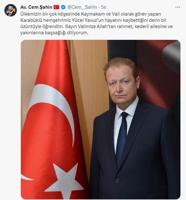 AK Parti Karabük Milletvekili Cem Şahin, yayımladığı taziye mesajında, “Ülkemizin bir çok köşesinde Kaymakam ve Vali olarak görev yapan Karabüklü hemşehrimiz Yücel Yavuz’un hayatını kaybettiğini derin bir üzüntüyle öğrendim. Sayın Valimize Allah’tan rahmet, kederli ailesine ve yakınlarına başsağlığı diliyorum.” ifadelerine yer verdi.