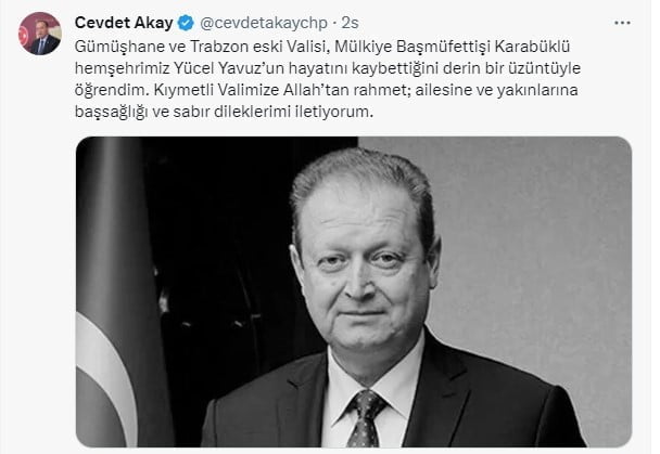 CHP Karabük Milletvekili Cevdet Akay yayımladığı taziye mesajında, “Gümüşhane ve Trabzon eski Valisi, Mülkiye Başmüfettişi Karabüklü hemşehrimiz Yücel Yavuz’un hayatını kaybettiğini derin bir üzüntüyle öğrendim. Kıymetli Valimize Allah’tan rahmet; ailesine ve yakınlarına başsağlığı ve sabır dileklerimi iletiyorum.” dedi.