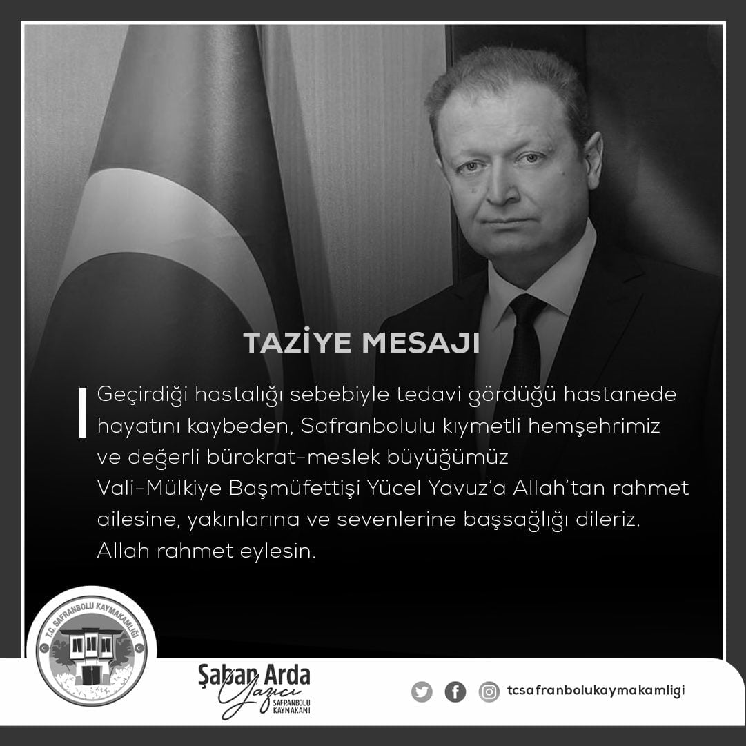 Safranbolu Kaymakamı Şaban Arda Yazıcı ise yayımladığı taziye mesajında, “Hastalığı sebebiyle tedavi gördüğü hastanede hayatını kaybeden, 2014-16 Köse Kaymakamlığı dönemimde maiyetinde çalıştığım, kıymetli hemşehrimiz ve meslek büyüğüm Vali-Mülkiye Başmüfettişi Yücel Yavuz’a Allah’tan rahmet ailesine ve sevenlerine başsağlığı dilerim. Makamı âli olsun.” ifadelerine yer verdi.