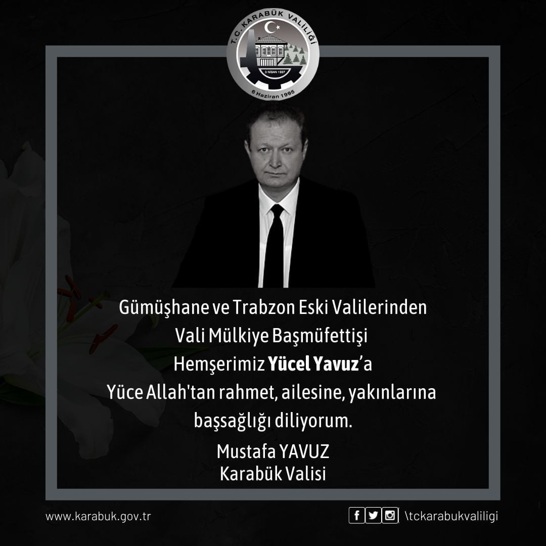 Karabük Valisi Mustafa Yavuz, Hemşehrimiz Vali Yücel Yavuz’un vefatı sebebiyle yayımladığı taziye mesajında, “Gümüşhane ve Trabzon Eski Valilerinden Vali Mülkiye Müfettişi Hemşehrimiz Yücel Yavuz’a Yüce Allah’tan rahmet, ailesine, yakınlarına başsağlığı diliyorum.” dedi.