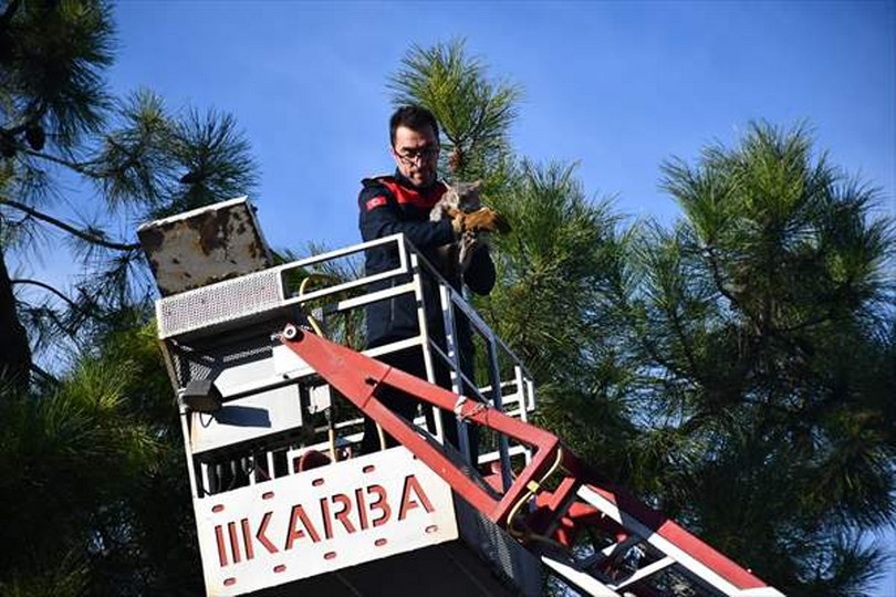 Ekipler, merdiven aracıyla mahsur kalan kediyi kurtardı. Korktuğu gözlenen kedi, bir süre itfaiyecinin kucağından inmek istemedi.