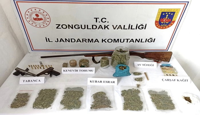 Zonguldak’ta, jandarma ekiplerinin son 3 ayda uyuşturucuyla mücadele çalışmaları kapsamında yakalanan 63 şüpheliden 13’ü tutuklandı, düzenlenen 36 operasyonda, çeşitli miktarlarda uyuşturucu, 39 uyuşturucu kullanma aparatı, 8 tabanca, 178 tabanca mühimmatı ve 4 hassas terazi ele geçirildi. ( Zonguldak Valiliği – Anadolu Ajansı )